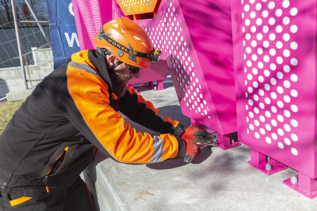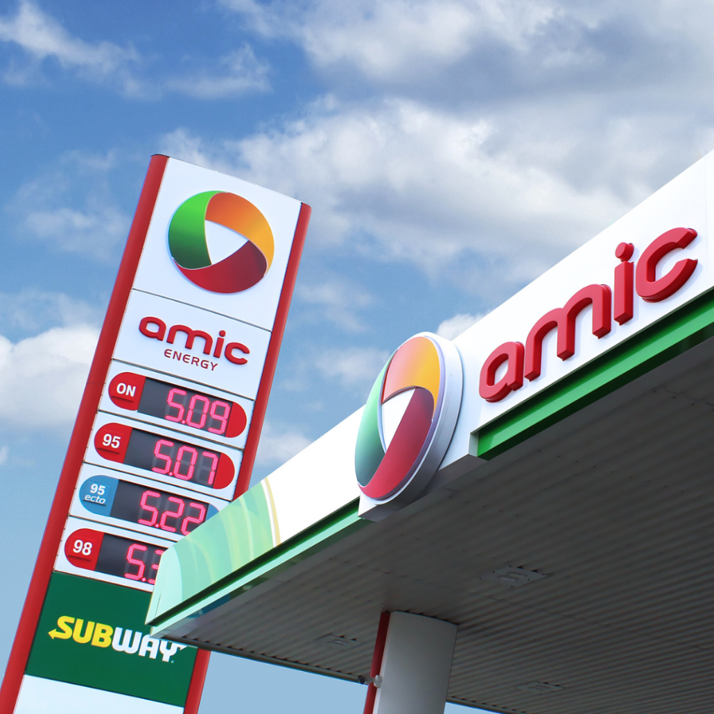 Projekt oparto na prostej formie, monochromatycznych logotypach i wysokiej jakości wykonania. Czterostronna budowa zapewnia dobrą widoczność, a stonowana kolorystyka pozwala wkomponować obiekt w przestrzeń.