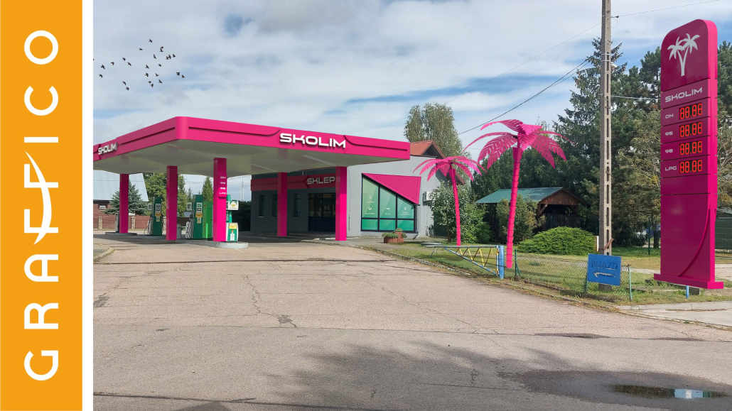 To wygląda bardziej jak dekoracja klipu muzycznego niż klasyczna stacja paliw. I dokładnie o to chodzi – wizualnie stacja wpisuje się w estetykę Skolima i świata disco/latino.